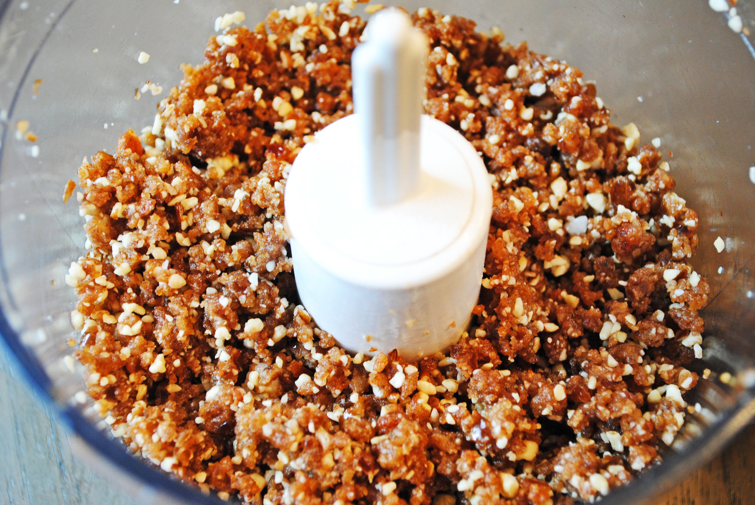 - Combine cashews and pecans in a food processor and pulse until very crumbly. Be careful to not over process or you'll blend them into a nut butter.
