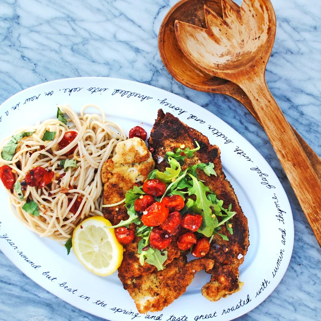 Happy Tuesday my friends! It was a busy weekend and beginning to the week. Mr. No FOMO Food turned 30 and I trekked back to my hometown to attend my 10-year high school reunion. It was a weekend loaded with milestones and we celebrated accordingly! It is with clarity and much enthusiasm that my husband requested an Italian dinner for his birthday meal. We love every genre of Italian so in honor of him- I present to you this beautiful Chicken Milanese with Roasted Cherry Tomatoes.