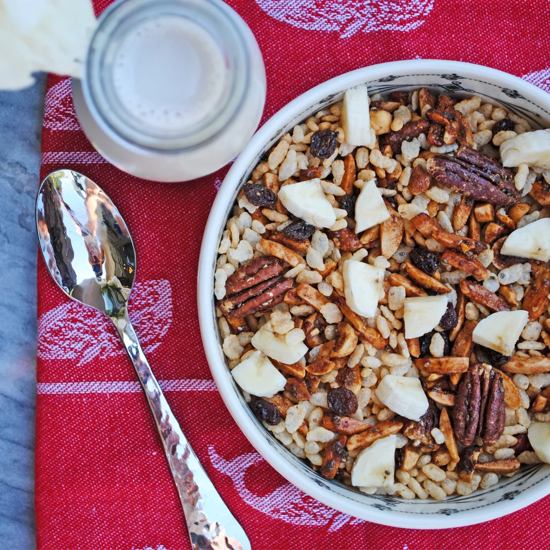 Mornings and cereal go together like frosting and cake! I haven't been eating as much cereal in life as of the last couple of years because..hello, insane amounts of added sugar!!! I set out to make my own recipe and this version is killer! This cereal is bursting with sweet roasted nuts and uses puffed brown rice as the base. I topped with bananas and unsweetened almond milk for this splendid all-American style breakfast. I hope you love it!