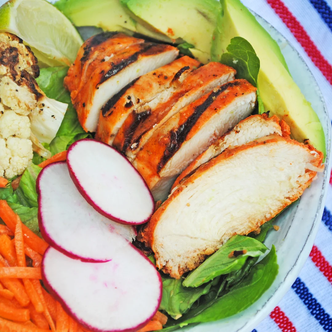I had been making a version of this grilled chicken but recently found a recipe in the Lexi's Clean Kitchen cookbook. The version I've included today is an adaption of my recipe + hers. The chicken breast gets grilled which helps retains all of its tenderness and moisture leaving you with a divine piece of poultry to top off a waistline friendly romaine salad. A fresh lime vinaigrette brightens up the whole thing while a few slices of creamy avocado cool off spiciest spicy chicken slices. Fresh thinly sliced red radishes, grilled cauliflower (you've already got the grill on! Slice cauli head into 1 inch "steaks" and rub down with olive oil & S+P) and shredded carrots round the whole plate out with all the nutrition your body needs.